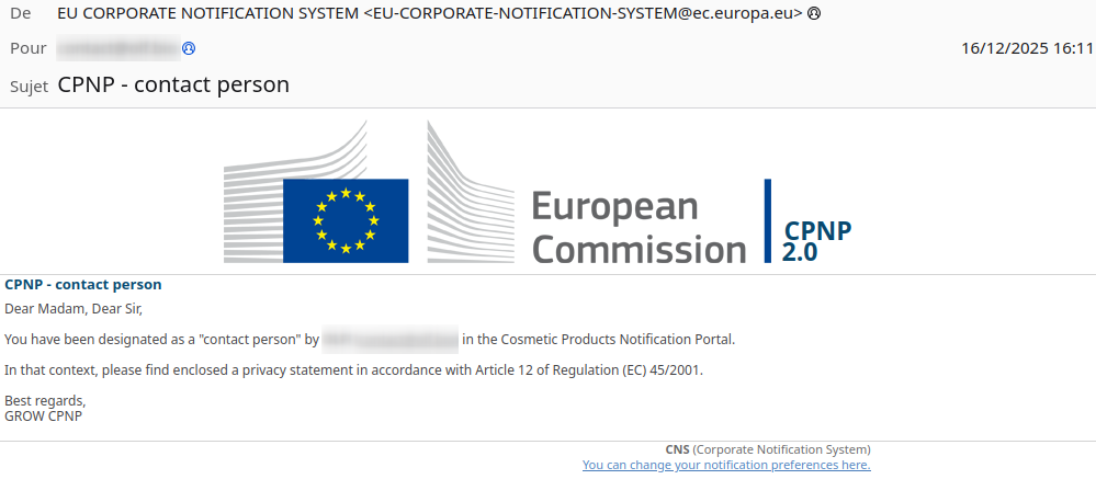 Lorsque vous recevrez ce type d’email, vous serez en mesure de vous connecter au portail CPNPCosmetic Products Notification Portail : Portail de notification européen pour les produits cosmétiques. More avec votre identifiant UE.