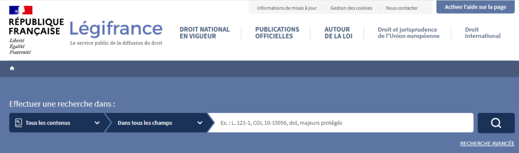 L’ensemble des textes de droit français sont accessibles via le portail Legifrance : https://www.legifrance.gouv.fr/