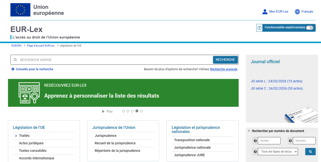 L’ensemble des textes de droit européen (Règlements notamment) est disponible sur le portail eur-Lex https://eur-lex.europa.eu/homepage.html?locale=fr