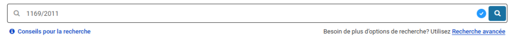 Exemple : Pour rechercher le RÈGLEMENT (UE) N°1169/2011 concernant l’information des consommateurs sur les denrées alimentaires (INCO) , il suffit de taper :