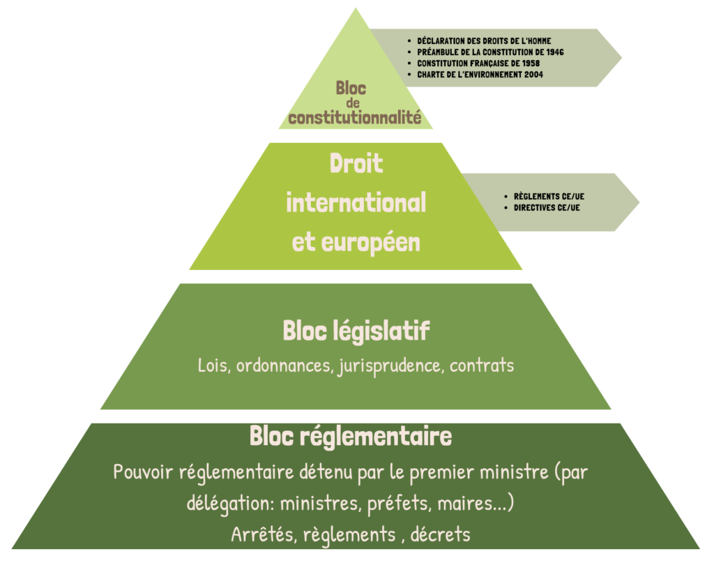 La « loi » est régie par différents textes, qui ont des valeurs différentes, selon une hiérarchie précise (voir schéma ci-dessous). Les textes en haut de la pyramide s’appliquent de façon prioritaire par rapport aux textes qui sont au-dessous. D’une façon générale, il faut bien garder en tête que la législation européenne prévaut toujours sur la législation nationale.