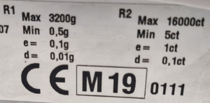 Cette balance a une résolution d de 0,01 g, elle affiche donc 2 chiffres après la virgule mais l’échelon de vérification e est de 0,1 g.
