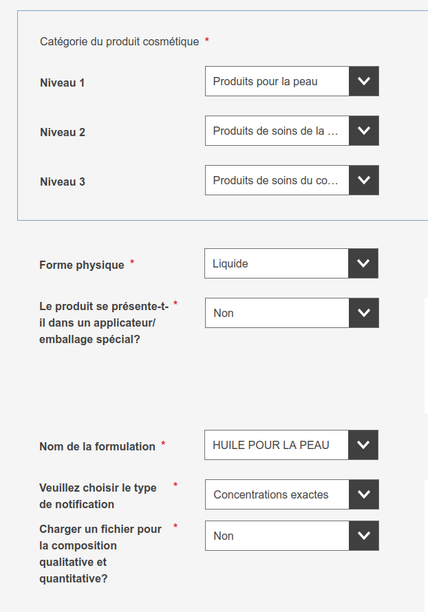 Ensuite, on peut choisir entre la déclaration de sa formule exacte (méthode la plus simples) ou bien par gamme (fourchette) de concentrations, pour garder la formule secrète. Chaque ingrédient sera identifié par son nom INCI officiel, celui que vous aurez retrouvé dans la base Cosing.