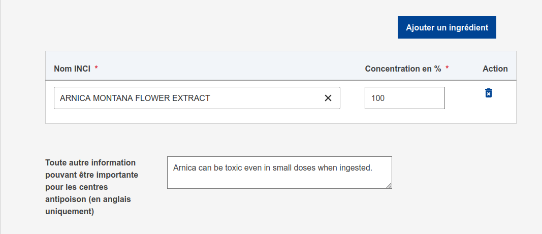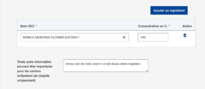 Lors de la notification sur le portail CPNP, vous devrez utiliser un nom INCINomenclature Internationale des Ingrédients de Cosmétiques More existant , par exemple : ARNICA MONTANA FLOWER EXTRACT